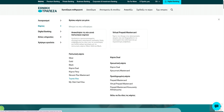 Μεταβείτε στην κεντρική σελίδα της ΕΤΕ στη διεύθυνση www.nbg.gr. Από το μενού “Προϊόντα & Υπηρεσίες”, επιλέξτε “Κάρτες” για να δείτε όλες τις διαθέσιμες επιλογές πιστωτικών και χρεωστικών καρτών.