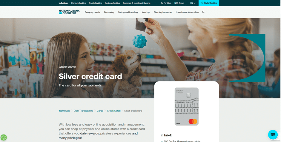Στην ενότητα Πιστωτικές Κάρτες, εντοπίστε τη Silver Card. Κάνοντας κλικ πάνω της, μπορείτε να δείτε αναλυτικά πληροφορίες για τα χαρακτηριστικά, τα επιτόκια και τα προγράμματα επιβράβευσης που προσφέρει.