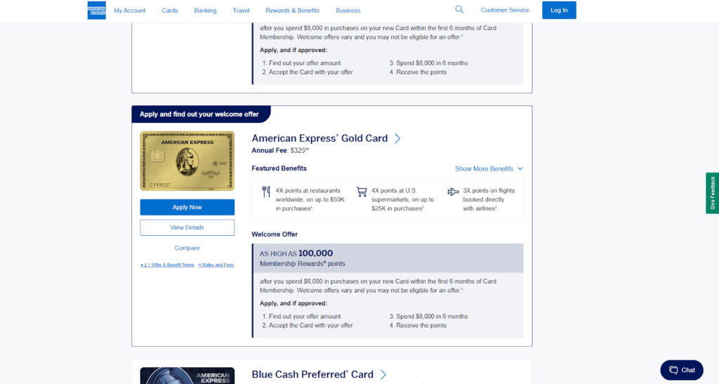 On the next page, you’ll find several credit card options, such as the Gold Card, Blue Cash Preferred, and Blue Cash Everyday.
