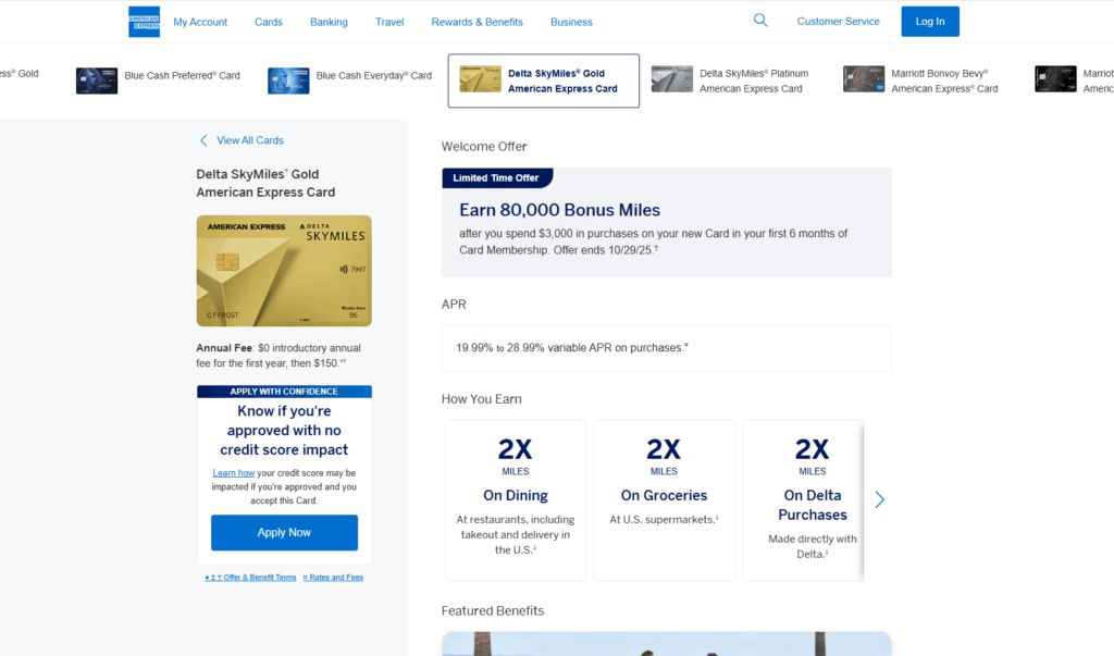 - Navigate to the American Express website and locate the Delta SkyMiles Gold Card page under their credit card offerings.