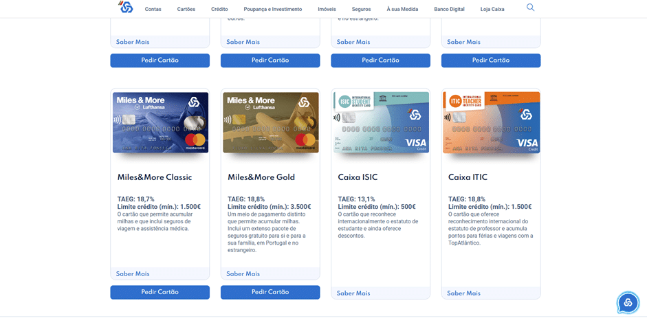 - O Cartão Caixa ISIC terá a descrição: “O cartão que reconhece internacionalmente o estatuto de estudante e ainda oferece descontos.” e Limite crédito (mín.): $500€$.
