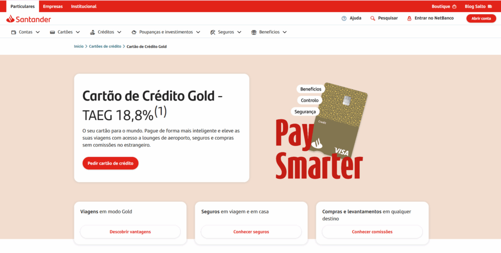 Palavras-Chave de Foco SEO: Cartão de Crédito Santander Gold, solicitar Cartão Gold, TAEG Santander Gold, anuidade Cartão Gold, benefícios Cartão Gold, limite de crédito Santander Gold, seguros viagens Cartão Gold.