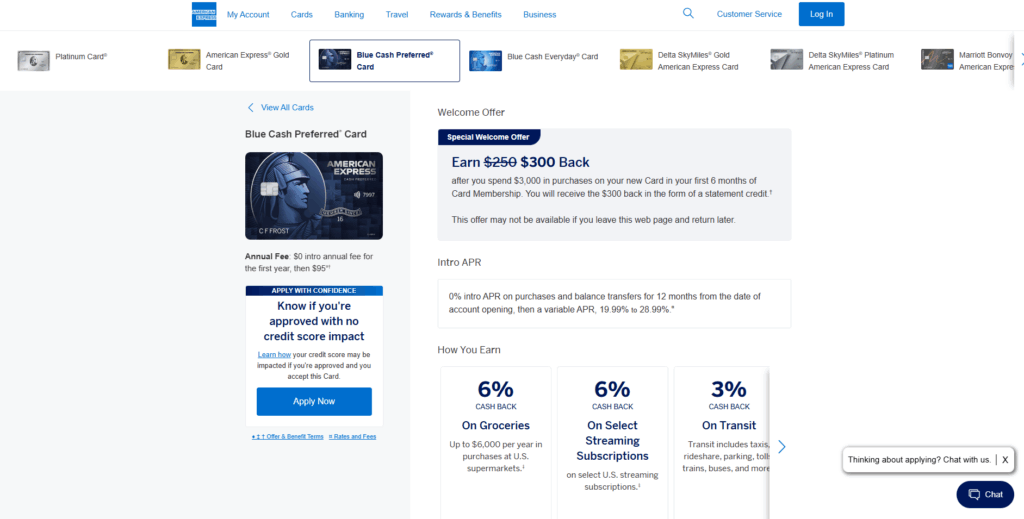 On this page, you’ll see all the details about the Blue Cash Card, including cashback categories, fees, and benefits.